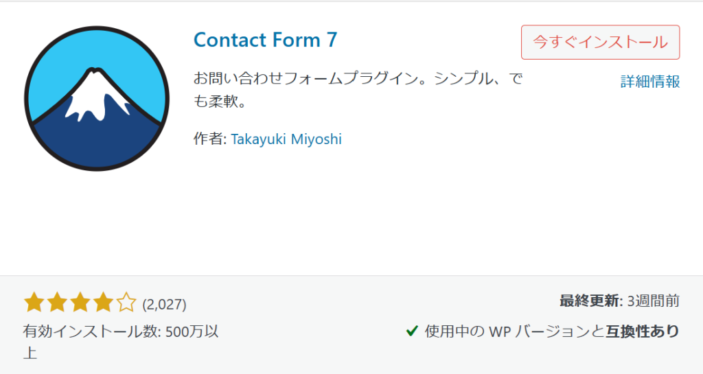 Contact Form 7がありますので、右上の「今すぐインストール」ボタンをクリックします。