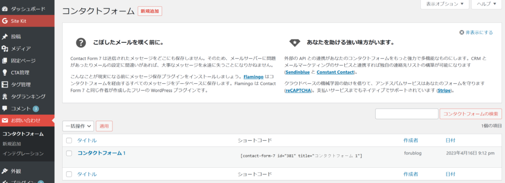 そのため「Contact Form 7」というプラグインど導入し、お問い合わせフォームを作る必要があります。