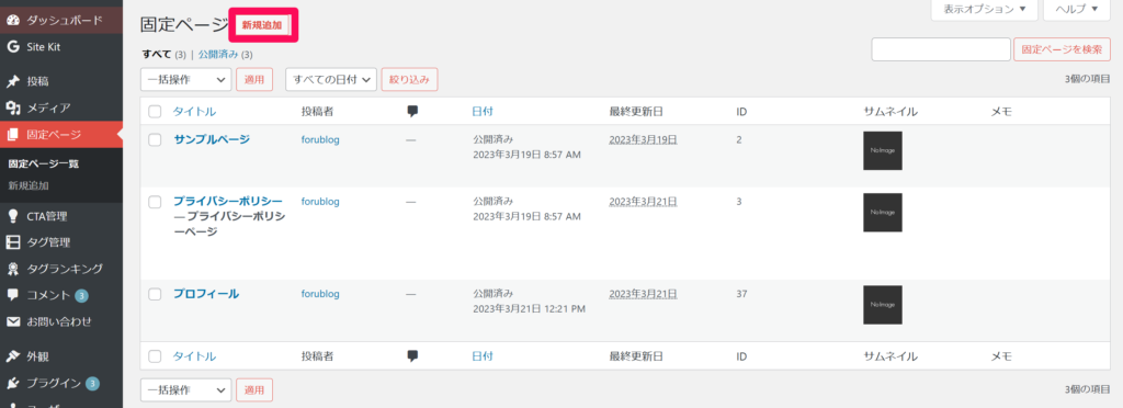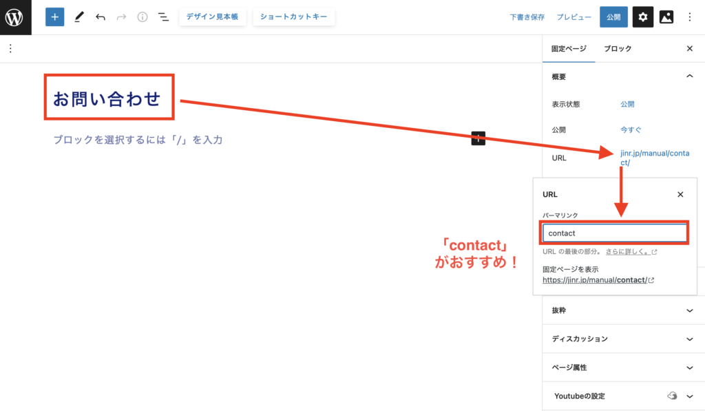 まず、初期設定の「お問い合わせページ」の設置方法を紹介します。