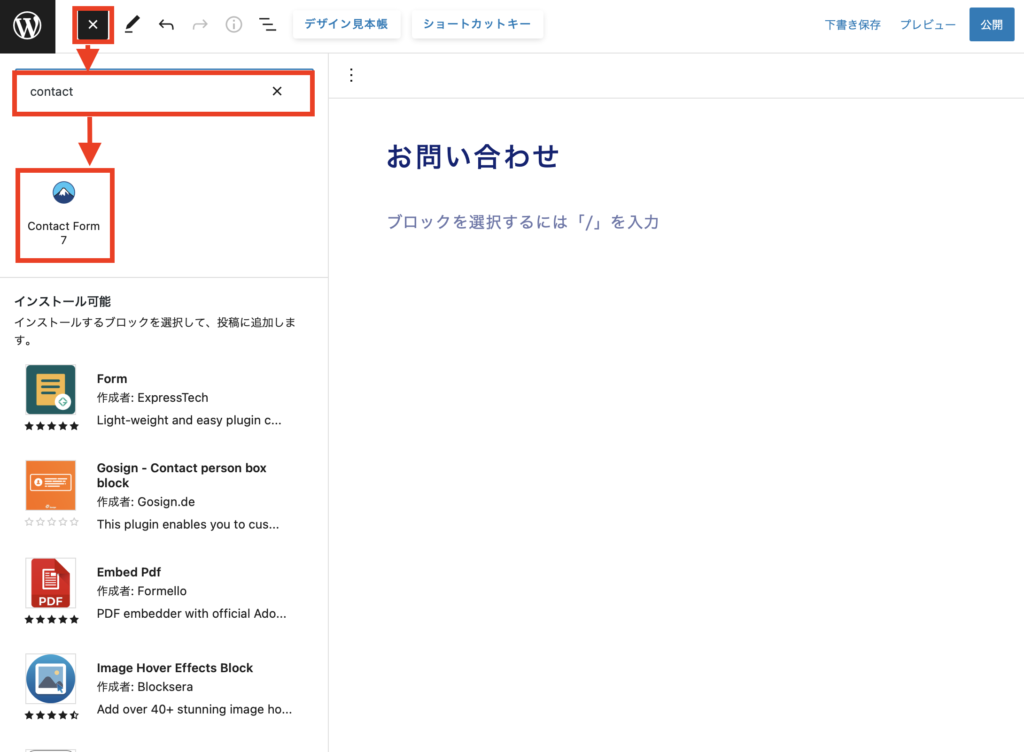 下記のプラグインの検索より「Contact Form 7」と入力してください。