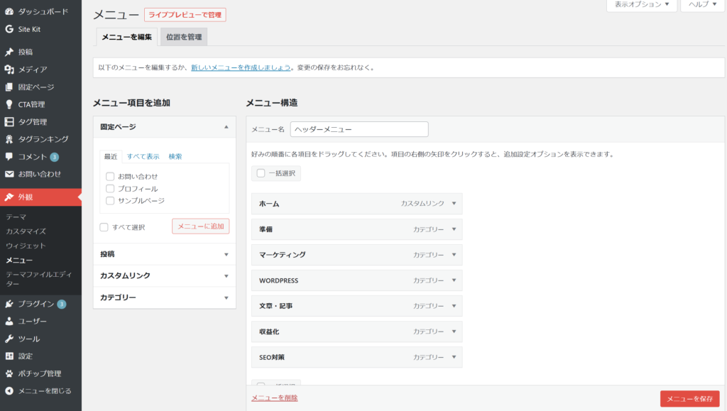 「お問い合わせ」を入れたいメニューをクリックして、保存をクリック。