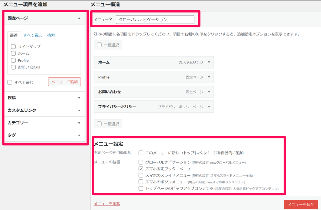 左の固定ページに先ほど作った「お問い合わせ」がありますので、メニューに追加をしてください。