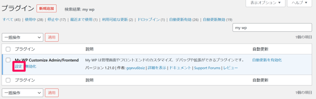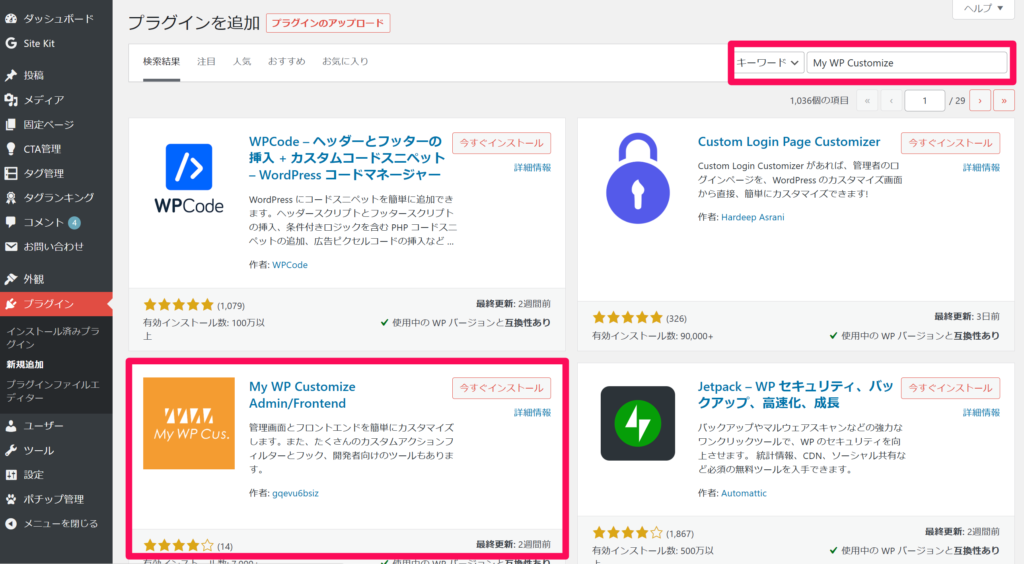 WordPressの管理画面より、プラグイン>新規追加>検索欄に「My WP Customize」と入力