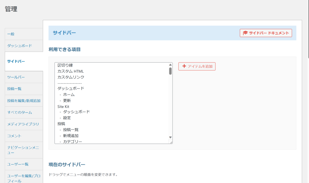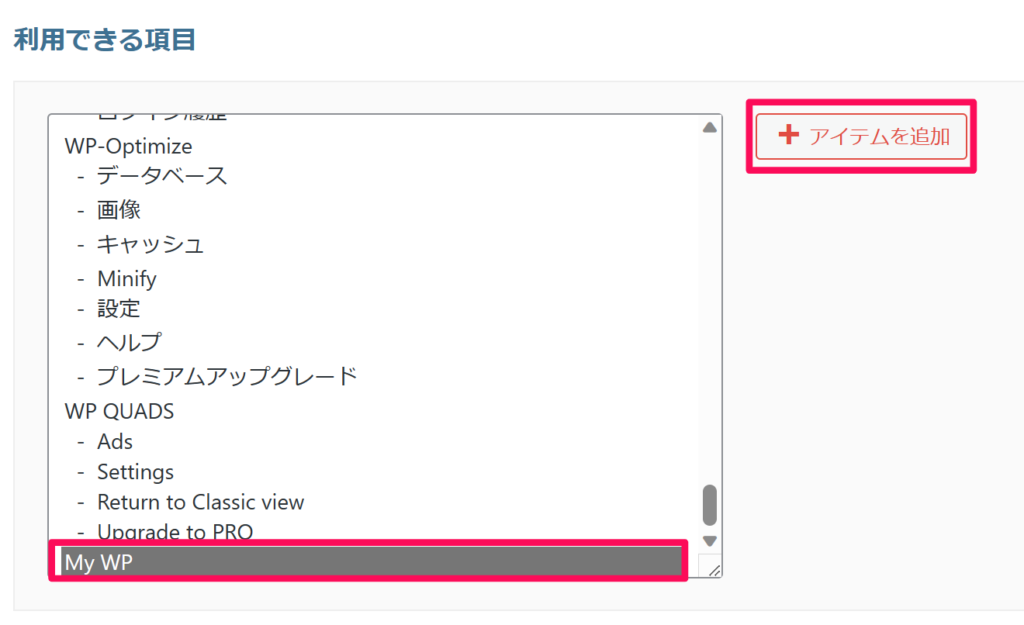 例えば、「My WP」を管理画面のサイドバーに入れたい場合、「+アイテムを追加」をクリック