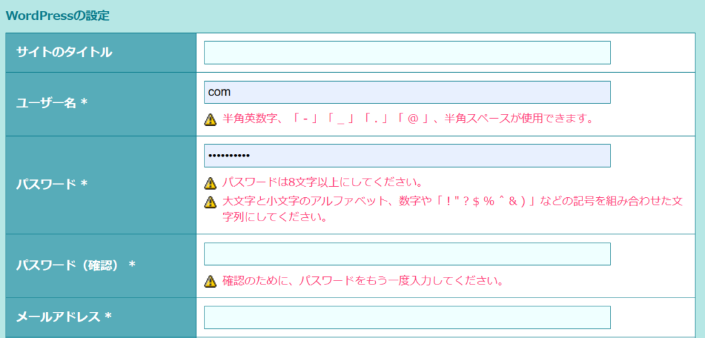 WordPressのインストールに必要なユーザー名やパスワードなどの情報を入力していきます。