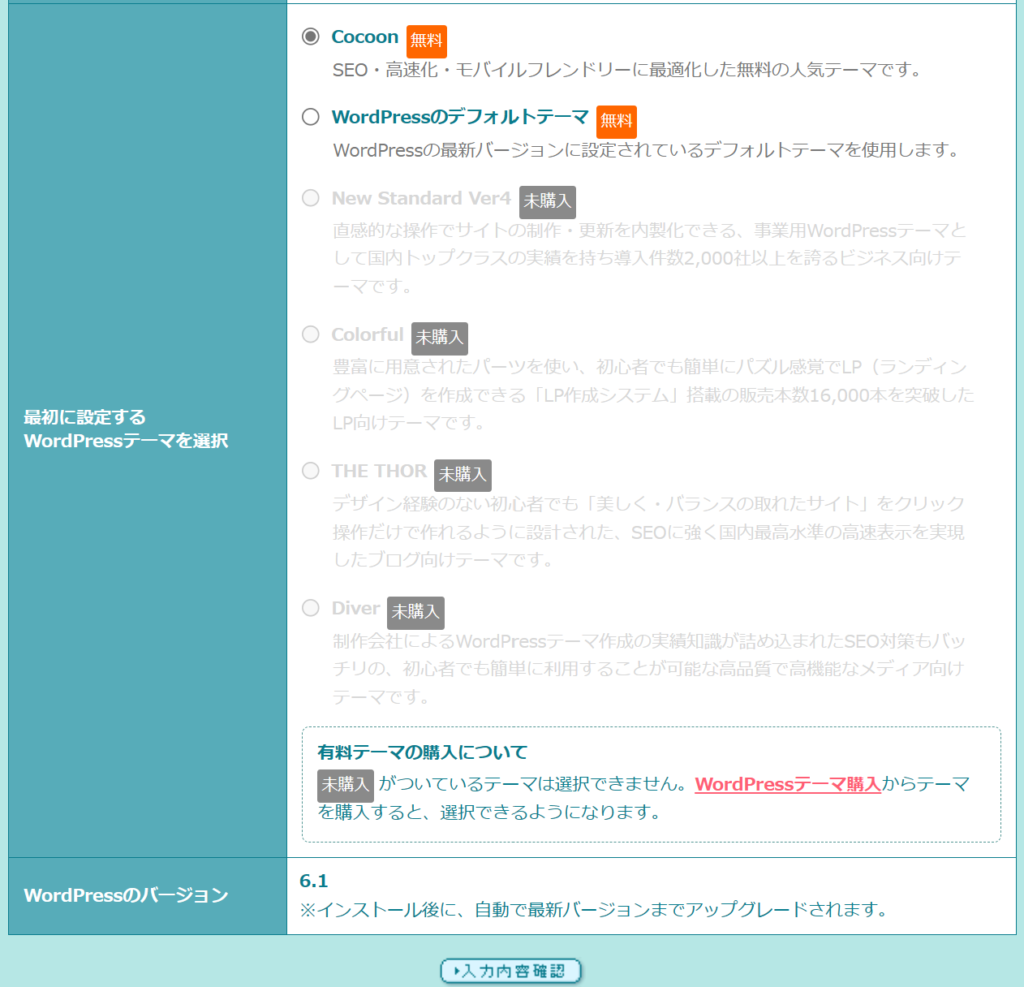WordPress管理用のメールアドレスを入力します。(例:事前に取得したgmail/yahooのメールアドレスを記入) - WORDPRESSのテーマを選択