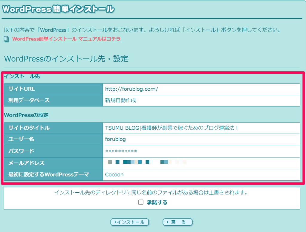 確認画面で「承諾する」にチェックを入れて、「インストール」をクリックすると、WordPressがインストールされます。