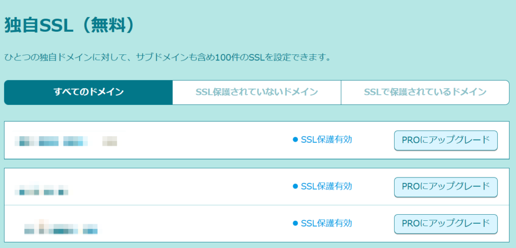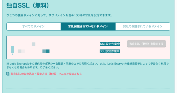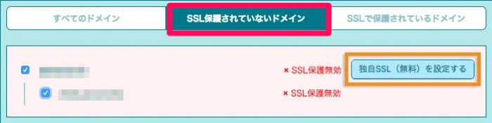 「SSL独自保護されていないドメイン」を選択し、あなたのドメインの左にチェックボックスがありますので「チェック」を入れて、「独自SSL(無料)を設定する」をクリックしてください。