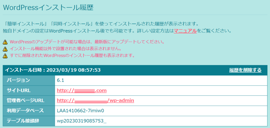 WordPress簡単インストールの完了後、独自ドメインのWordPressの情報が表示されてるはずです。